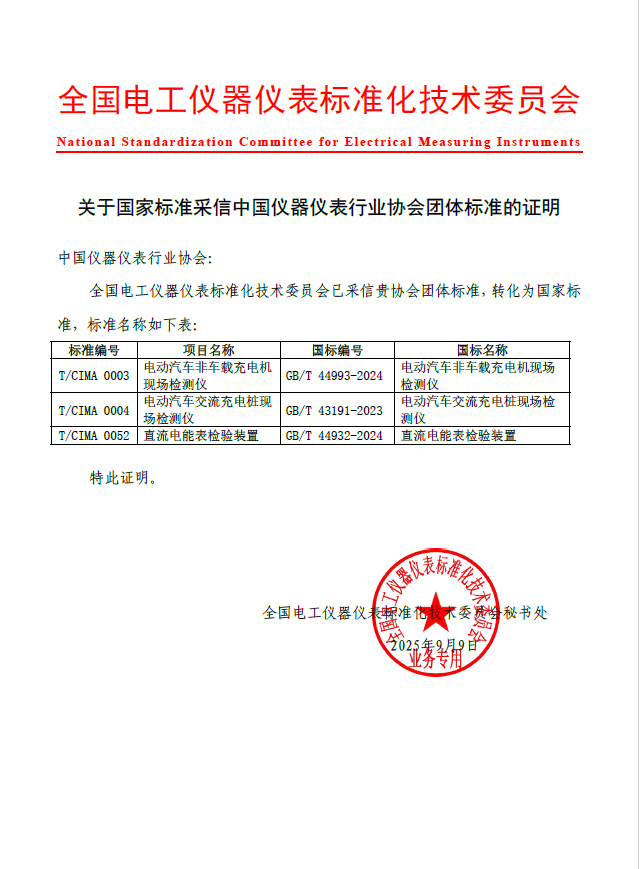 9月,全國電工儀器儀表標(biāo)準(zhǔn)化技術(shù)委員會給協(xié)會發(fā)來證明文件,協(xié)會的3項團體標(biāo)準(zhǔn)已被國標(biāo)委采信,正式轉(zhuǎn)化為國家標(biāo)準(zhǔn)。