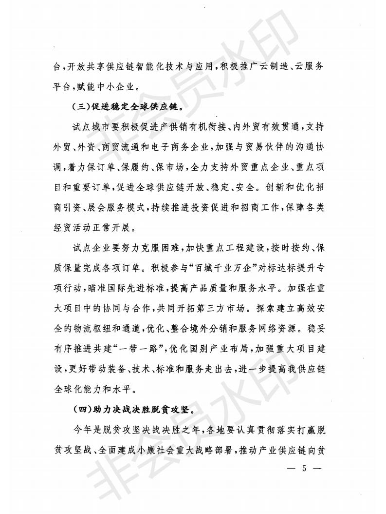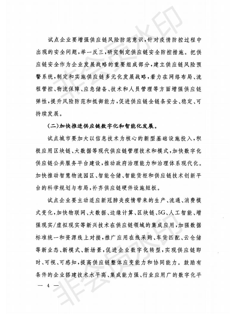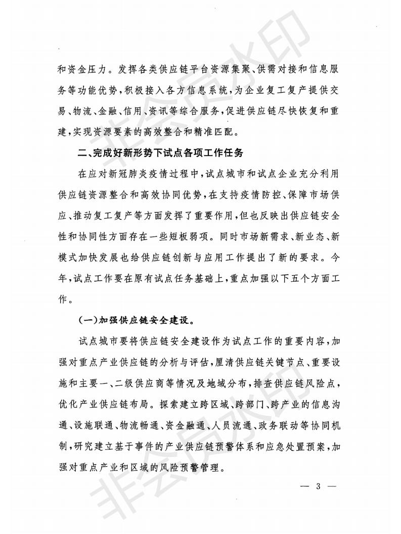 通知指出,為認(rèn)真貫徹落實(shí)打贏脫貧攻堅(jiān)戰(zhàn)、全面建成小康社會(huì)重大戰(zhàn)略部署和堅(jiān)持在常態(tài)化疫情防控中加快推進(jìn)生產(chǎn)生活秩序全面恢復(fù)相關(guān)要求,針對供應(yīng)鏈安全性和協(xié)同性方面存在的短板弱項(xiàng),積極應(yīng)對市場新需求、新業(yè)態(tài)、新模式加快發(fā)展給供應(yīng)鏈創(chuàng)新與應(yīng)用工作提出的新要求,要在原有試點(diǎn)任務(wù)基礎(chǔ)上,重點(diǎn)做好加強(qiáng)供應(yīng)鏈安全建設(shè)、加快推進(jìn)供應(yīng)鏈數(shù)字化和智能化發(fā)展、促進(jìn)穩(wěn)定全球供應(yīng)鏈、助力決戰(zhàn)決勝脫貧攻堅(jiān)和充分利用供應(yīng)鏈金融服務(wù)實(shí)體企業(yè)等五個(gè)方面工作。