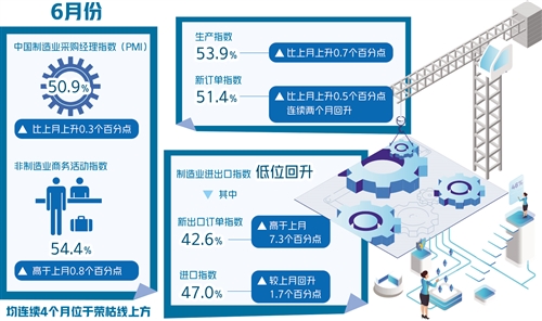 國家統計局服務業調查中心高級統計師趙慶河表示,6月份制造業生產指數和新訂單指數分別為53.9%51.4%,比上月上升0.7個和0.5個百分點,其中新訂單指數連續兩個月回升,表明供需兩端持續回暖。