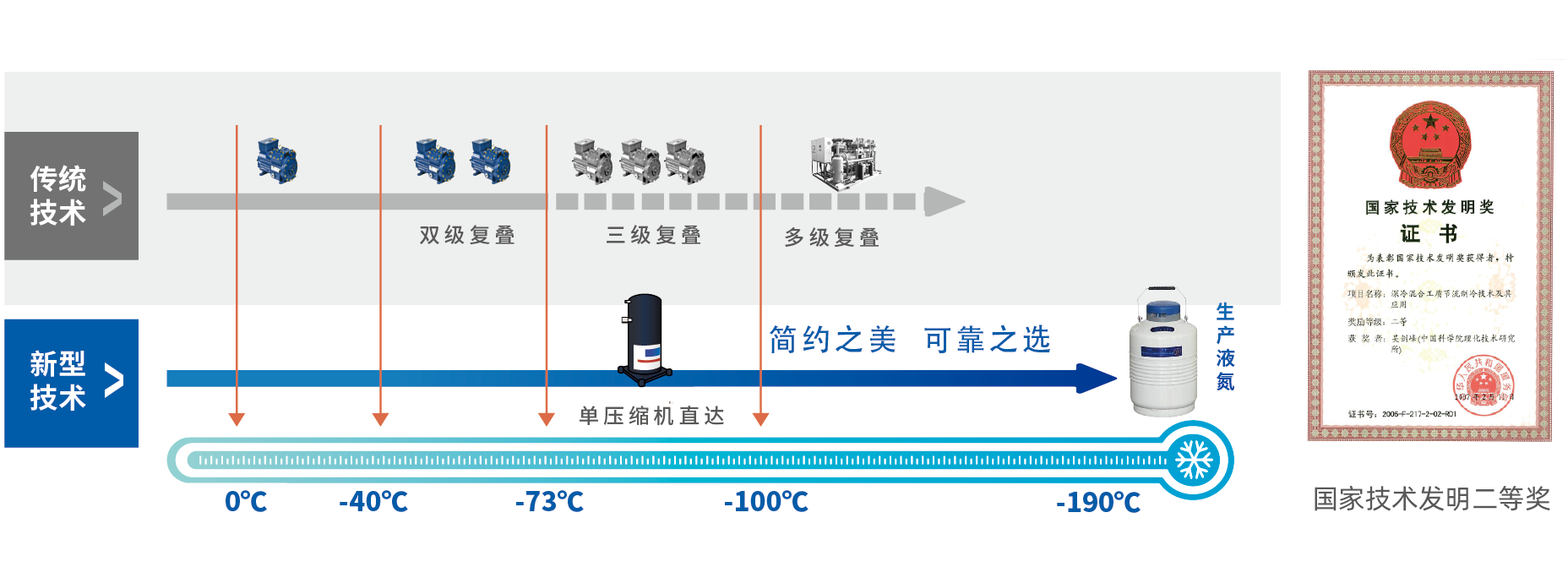 無需液氮制冷,使用一臺壓縮機即可實現(xiàn)機械制冷直達(dá)-190℃超低溫。