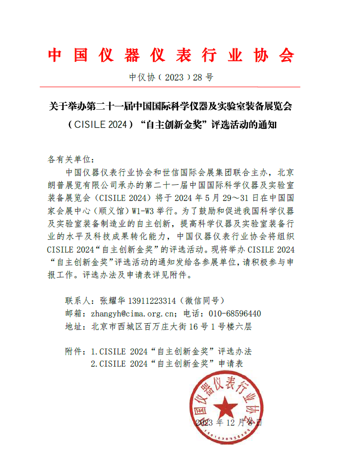中國儀器儀表行業(yè)協(xié)會和世信國際會展集團(tuán)聯(lián)合主辦,北京朗普展覽有限公司承辦的第二十一屆中國國際科學(xué)儀器及實(shí)驗(yàn)室裝備展覽會(CISILE 2024)將于2024年5月29~31日在中國國家會展中心(順義館)W1-W3舉行。為了鼓勵和促進(jìn)我國科學(xué)儀器及實(shí)驗(yàn)室裝備制造業(yè)的自主創(chuàng)新,提高科學(xué)儀器及實(shí)驗(yàn)室裝備行業(yè)的水平及科技成果轉(zhuǎn)化能力,中國儀器儀表行業(yè)協(xié)會將組織CISILE 2024“自主創(chuàng)新金獎”的評選活動。現(xiàn)將舉辦CISILE 2024“自主創(chuàng)新金獎”評選活動的通知發(fā)給各參展單位,請積極參與申報工作。評選辦法及申請表詳見附件。