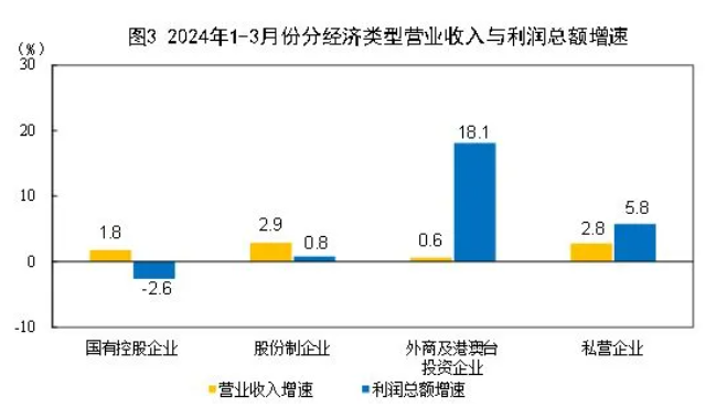 1-3月份,規(guī)模以上工業(yè)企業(yè)中,國(guó)有控股企業(yè)實(shí)現(xiàn)利潤(rùn)總額5738.2億元,同比下降2.6%;股份制企業(yè)實(shí)現(xiàn)利潤(rùn)總額11203.0億元,增長(zhǎng)0.8%;外商及港澳臺(tái)投資企業(yè)實(shí)現(xiàn)利潤(rùn)總額3737.5億元,增長(zhǎng)18.1%;私營(yíng)企業(yè)實(shí)現(xiàn)利潤(rùn)總額3679.7億元,增長(zhǎng)5.8%。