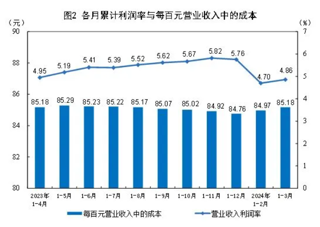 1-3月份,規(guī)模以上工業(yè)企業(yè)每百元營(yíng)業(yè)收入中的成本為85.18元,同比增加0.16元;每百元營(yíng)業(yè)收入中的費(fèi)用為8.54元,同比減少0.07元。