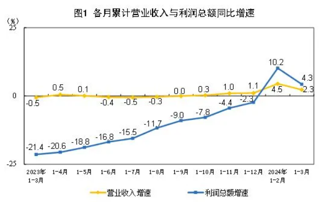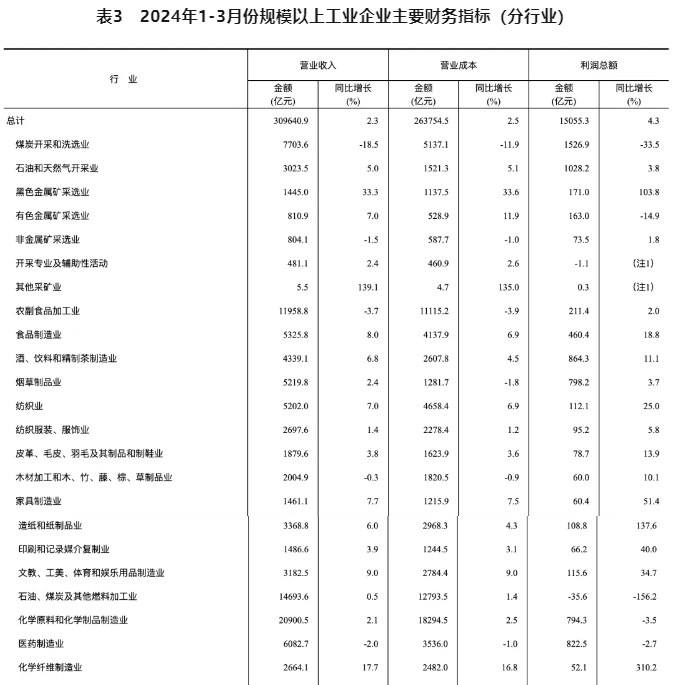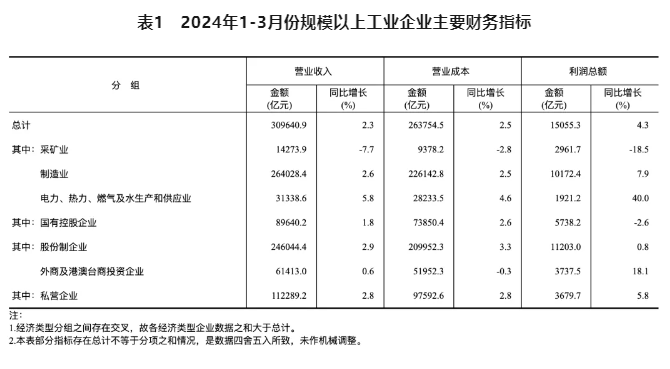 2024年1-3月份,全國(guó)規(guī)模以上工業(yè)企業(yè)實(shí)現(xiàn)利潤(rùn)總額15055.3億元,同比增長(zhǎng)4.3%(按可比口徑計(jì)算)。