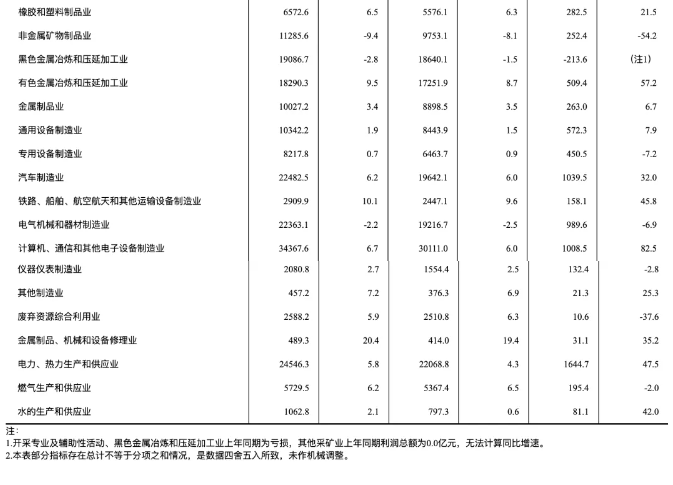 1-3月份,主要行業(yè)利潤(rùn)情況如下:計(jì)算機(jī)、通信和其他電子設(shè)備制造業(yè)利潤(rùn)增長(zhǎng)82.5%,有色金屬冶煉和壓延加工業(yè)增長(zhǎng)57.2%,電力、熱力生產(chǎn)和供應(yīng)業(yè)增長(zhǎng)47.5%,汽車制造業(yè)增長(zhǎng)32.0%,紡織業(yè)增長(zhǎng)25.0%,通用設(shè)備制造業(yè)增長(zhǎng)7.9%,石油和天然氣開采業(yè)增長(zhǎng)3.8%,農(nóng)副食品加工業(yè)增長(zhǎng)2.0%,化學(xué)原料和化學(xué)制品制造業(yè)下降3.5%,電氣機(jī)械和器材制造業(yè)下降6.9%,專用設(shè)備制造業(yè)下降7.2%,煤炭開采和洗選業(yè)下降33.5%,非金屬礦物制品業(yè)下降54.2%,石油煤炭及其他燃料加工業(yè)由盈轉(zhuǎn)虧,黑色金屬冶煉和壓延加工業(yè)虧損增加。
