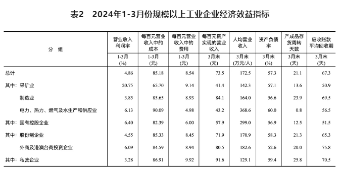 3月末,規(guī)模以上工業(yè)企業(yè)每百元資產(chǎn)實(shí)現(xiàn)的營(yíng)業(yè)收入為73.5元,同比減少2.9元;人均營(yíng)業(yè)收入為172.5萬(wàn)元,同比增加7.5萬(wàn)元;產(chǎn)成品存貨周轉(zhuǎn)天數(shù)為21.1天,同比持平;應(yīng)收賬款平均回收期為67.3天,同比增加3.8天。