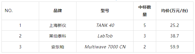 從中標(biāo)數(shù)量來看,位居榜首的則是上海新儀,中標(biāo)數(shù)量為7套;緊隨其后的是安東帕和上海屹堯,兩者均以5套的中標(biāo)量并列第二名;萊伯泰科則以4套的中標(biāo)量排在第三位;上海元析中標(biāo)2套,其他各品牌分別中標(biāo)1套。