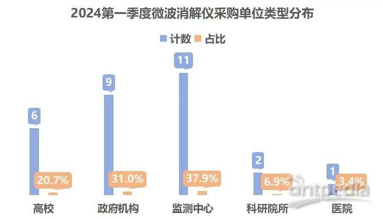 從采購單位類型來看,微波消解儀的用戶類型涵蓋高校。政府機構(gòu)、監(jiān)測中心、科研院所和醫(yī)院等。具體來看監(jiān)測中心在該季度展現(xiàn)出最強的購買力度,成為微波消解儀采購的首要用戶群體。緊隨其后的是政府機構(gòu),它們在采購微波消解儀方面也展現(xiàn)出了較高的活躍度。此外,高校作為科研和教學(xué)的重要場所,對微波消解儀的需求也不容忽視。