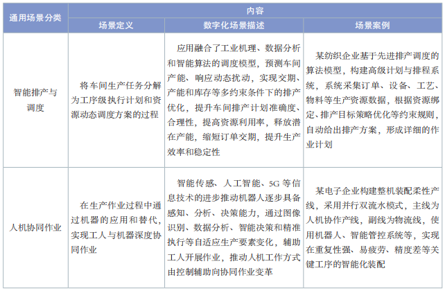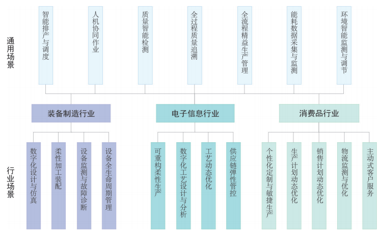 通用場景是指滿足不同行業(yè)數(shù)字化轉(zhuǎn)型共性需求的場景,具備在同行業(yè)內(nèi)及不同行業(yè)間的推廣價值。通用場景部分整理了裝備制造、電子信息和消費品 3 個行業(yè)存在共性需求和相似解決方案的數(shù)字化典型場景,包括智能排產(chǎn)與調(diào)度、人機協(xié)同作業(yè)、質(zhì)量智能檢測、全過程質(zhì)量追溯、全流程精益生產(chǎn)管理、能耗數(shù)據(jù)采集與監(jiān)測、環(huán)境智能監(jiān)測與調(diào)節(jié) 7個場景,場景內(nèi)容見表 1。