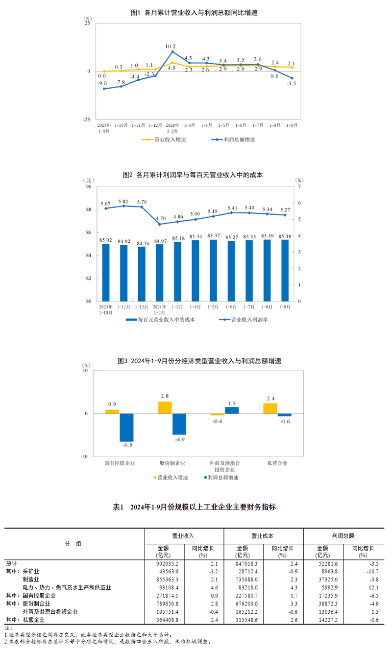 1—9月份,全國規模以上工業企業實現利潤總額52281.6億元,同比下降3.5%(按可比口徑計算,詳見附注二)。