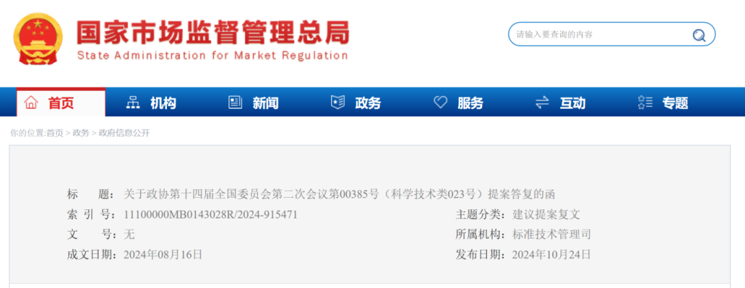 日前,市場監(jiān)管總局在《關(guān)于政協(xié)第十四屆全國委員會第二次會議第00385號(科學(xué)技術(shù)類023號)提案答復(fù)的函》中表示,市場監(jiān)管總局(國家標(biāo)準(zhǔn)委)高度重視標(biāo)準(zhǔn)化支撐高質(zhì)量發(fā)展的基礎(chǔ)性引領(lǐng)性作用,正加快推動相關(guān)工作。具體內(nèi)容如下: