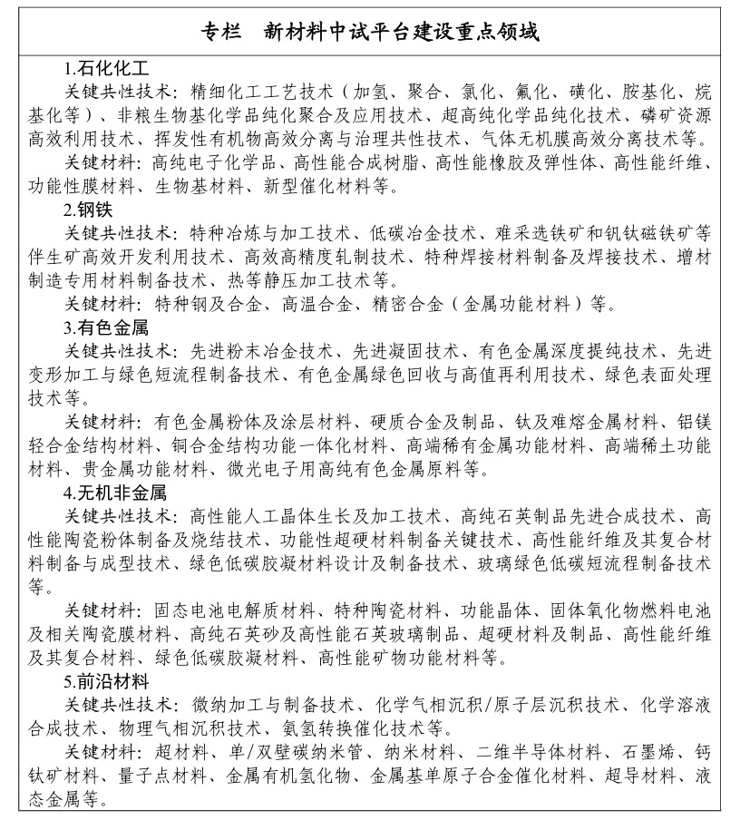 文件也進一步明確了新材料中試平臺建設重點領域,詳情如下所示: