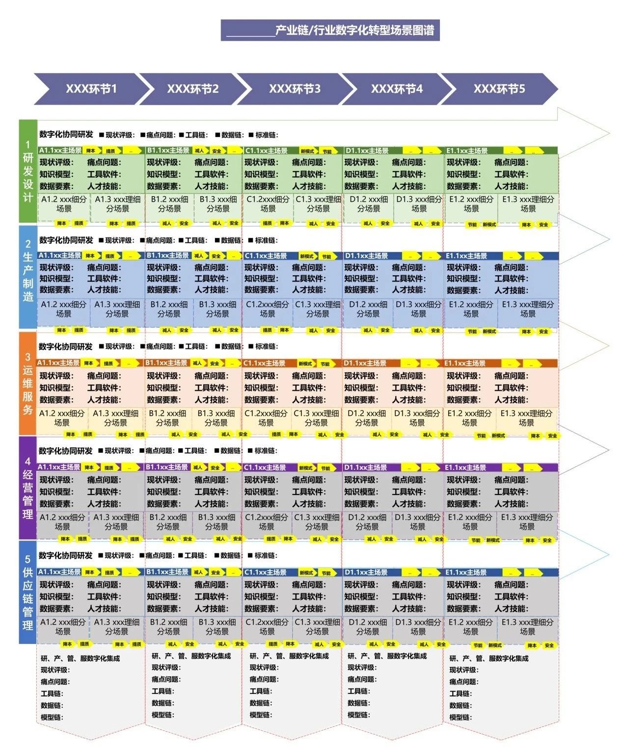 聚焦產業鏈上下游企業研發設計、生產制造、運維服務、經營管理、供應鏈管理等場景,以場景為切入點梳理數字化轉型痛點需求,繪制重點行業、重點產業鏈數字化轉型場景圖譜(簡稱一圖譜),明確企業數字化轉型路徑,促進產業鏈上下游企業協同開展轉型升級。分場景梳理數據要素、知識模型、工具軟件、人才技能等數字化轉型要素清單(簡稱四清單,合稱一圖四清單),助力政產學研各界聯合攻堅場景數字化轉型關鍵難點。