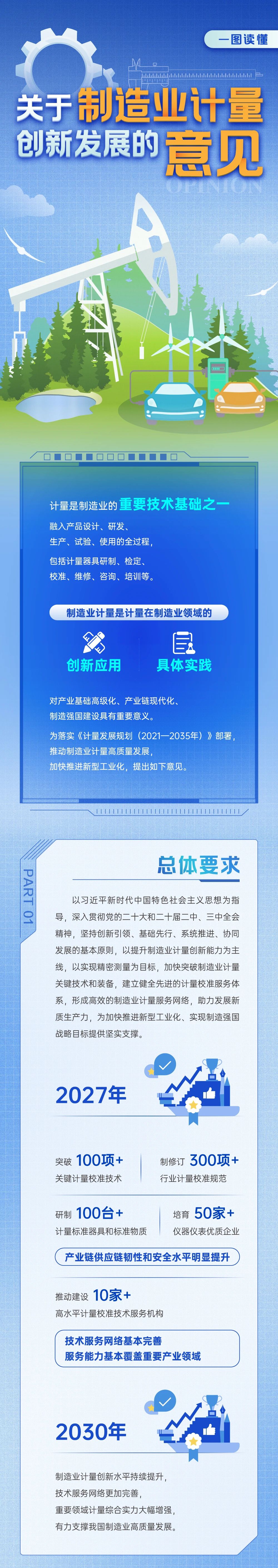《意見(jiàn)》是制造業(yè)計(jì)量領(lǐng)域首個(gè)政策性文件,堅(jiān)持創(chuàng)新引領(lǐng)、基礎(chǔ)先行、系統(tǒng)推進(jìn)、協(xié)同發(fā)展的基本原則,以提升制造業(yè)計(jì)量創(chuàng)新能力為主線,以實(shí)現(xiàn)精密測(cè)量為目標(biāo),結(jié)合當(dāng)前產(chǎn)業(yè)現(xiàn)狀和制造業(yè)高質(zhì)量發(fā)展要求,提出到2027年,制造業(yè)計(jì)量發(fā)展取得積極進(jìn)展,突破100項(xiàng)以上關(guān)鍵計(jì)量校準(zhǔn)技術(shù),制修訂300項(xiàng)以上行業(yè)計(jì)量校準(zhǔn)規(guī)范,研制100臺(tái)套以上計(jì)量器具和標(biāo)準(zhǔn)物質(zhì),產(chǎn)業(yè)鏈供應(yīng)鏈韌性和安全水平明顯提升,培育50家以上儀器儀表優(yōu)質(zhì)企業(yè),推動(dòng)建設(shè)10家以上制造業(yè)高水平計(jì)量校準(zhǔn)技術(shù)服務(wù)機(jī)構(gòu),技術(shù)服務(wù)網(wǎng)絡(luò)基本完善,服務(wù)能力基本覆蓋重要產(chǎn)業(yè)領(lǐng)域。到2030年,制造業(yè)計(jì)量創(chuàng)新水平持續(xù)提升,技術(shù)服務(wù)網(wǎng)絡(luò)更加完善,重要領(lǐng)域計(jì)量綜合實(shí)力大幅增強(qiáng),有力支撐我國(guó)制造業(yè)高質(zhì)量發(fā)展。