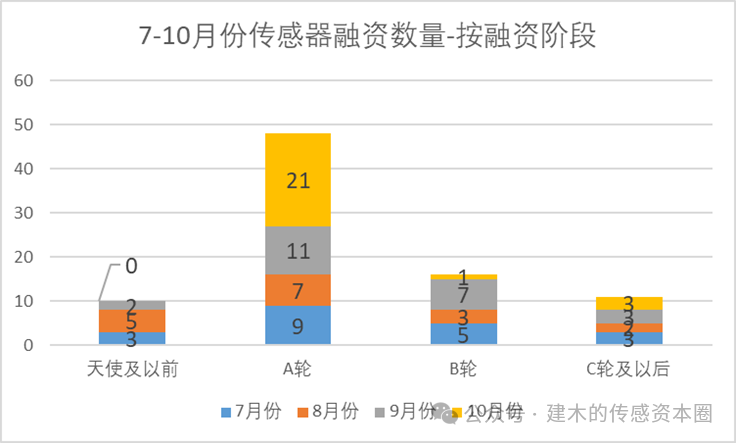 2025年7-10月份傳感器行業(yè)的融資數(shù)量和輪次統(tǒng)計(jì)如下。2025年7-10月共有85起融資案例,分別為20、17、22、25起融資,融資數(shù)量相對(duì)比較穩(wěn)定,平均每月20起左右。