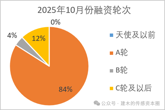 2025年10月份的25起融資事件中,84%的融資落在了A輪階段,沒(méi)有出現(xiàn)天使輪融資,B輪及以后階段的融資大幅減少。
