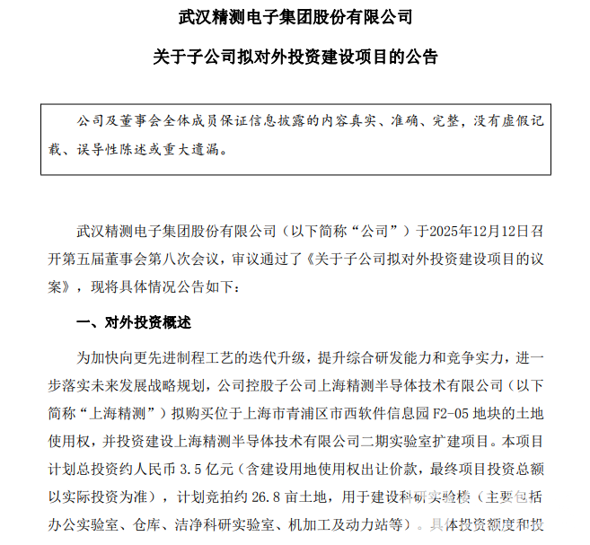 1212日,精測電子(300567.SZ)公布,為加快向更先進制程工藝的迭代升級,提升綜合研發能力和競爭實力,進一步落實未來發展戰略規劃,公司控股子公司上海精測半導體技術有限公司(簡稱“上海精測”)擬購買位于上海市青浦區市西軟件信息園F2-05地塊的土地使用權,并投資建設上海精測半導體技術有限公司二期實驗室擴建項目。