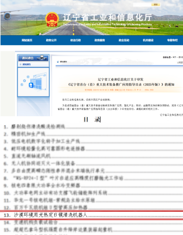 新年伊始,遼寧省工業(yè)和信息化廳正式印發(fā)《遼寧省首臺(套)重大技術裝備推廣應用指導目錄(2025年版)》。我院申報的《沙漠環(huán)境用光熱定日鏡清洗機器人》 項目經過嚴格評審,成功獲得“首臺(套)”重大技術裝備認定,并被納入省級推廣應用名錄。這是我院在高端裝備研發(fā)與產業(yè)化應用領域取得的又一重要突破!