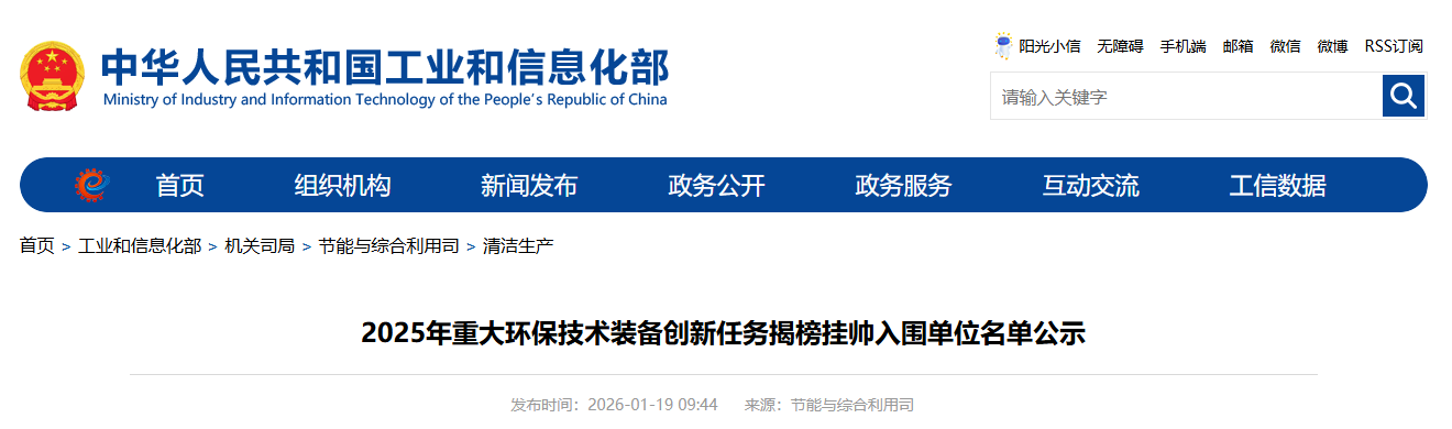 工業和信息化部根據《關于組織開展2025年重大環保技術裝備創新任務揭榜掛帥工作的通知》(工信廳節函〔2025〕399號)要求,經自愿申報、省級工業和信息化主管部門推薦、專家評審,遴選確定了2025年重大環保技術裝備創新任務揭榜掛帥入圍單位名單,現已發布公示名單。